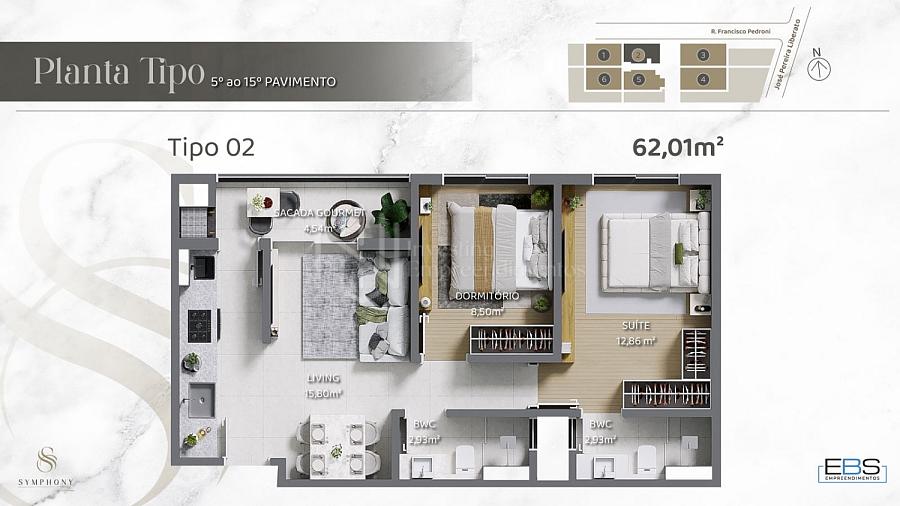 Oferecendo infraestrutura de lazer completa para seus moradores, o empreendimento traz também plantas de 62 m² a 88 m² privativos com alto padrão de acabamento, piso porcelanato na área comum, vinílico nos dormitórios, janelas panorâmicas para valorizar a vista da cidade.